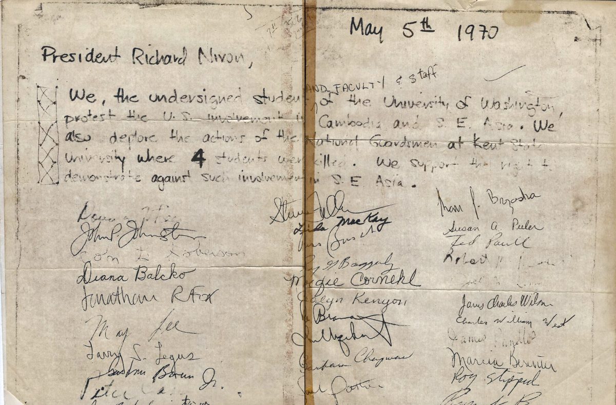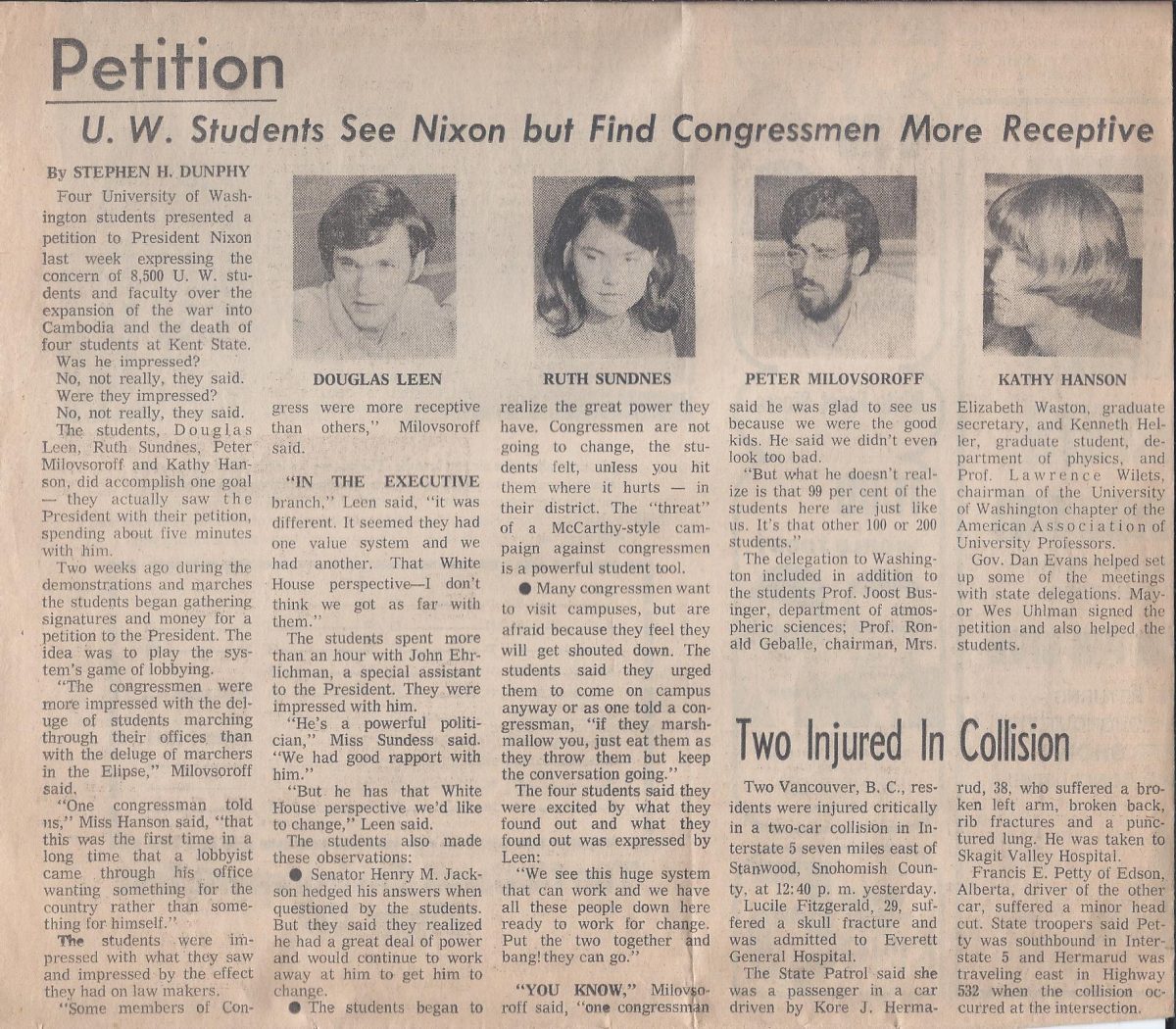So…..the Spring of 1970 all hell broke loose on most campuses around the country.  Nixon was President and he invaded a neutral country adjacent to Vietnam–Cambodia.  Then, four peacefully protesting, unarmed students at Kent State University were gunned down by our own National Guard.  Another nine were wounded.   I grabbed a roll of computer print-out paper (a wide, perforated folding paper for computers–and an endless scroll for my petition) and put a card table up in front of the Husky Union Building (HUB) and four days later I had 10,000 signatures, running over 300′ long with three columns of signatures.  Two faculty members came up to me and asked me to represent the University on a trip to Washington.  I accepted.