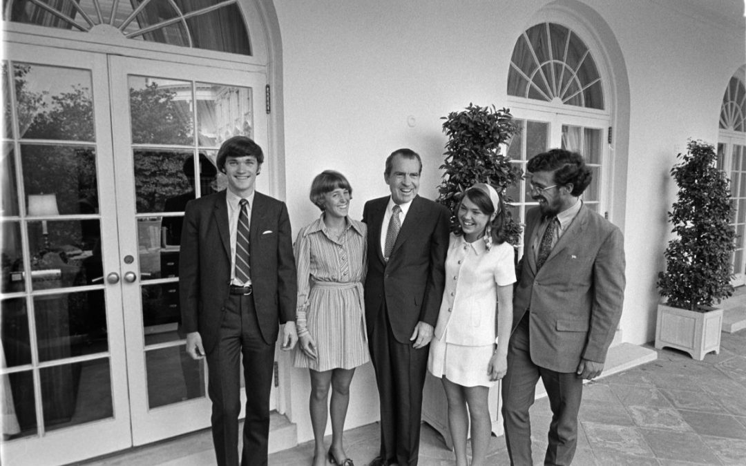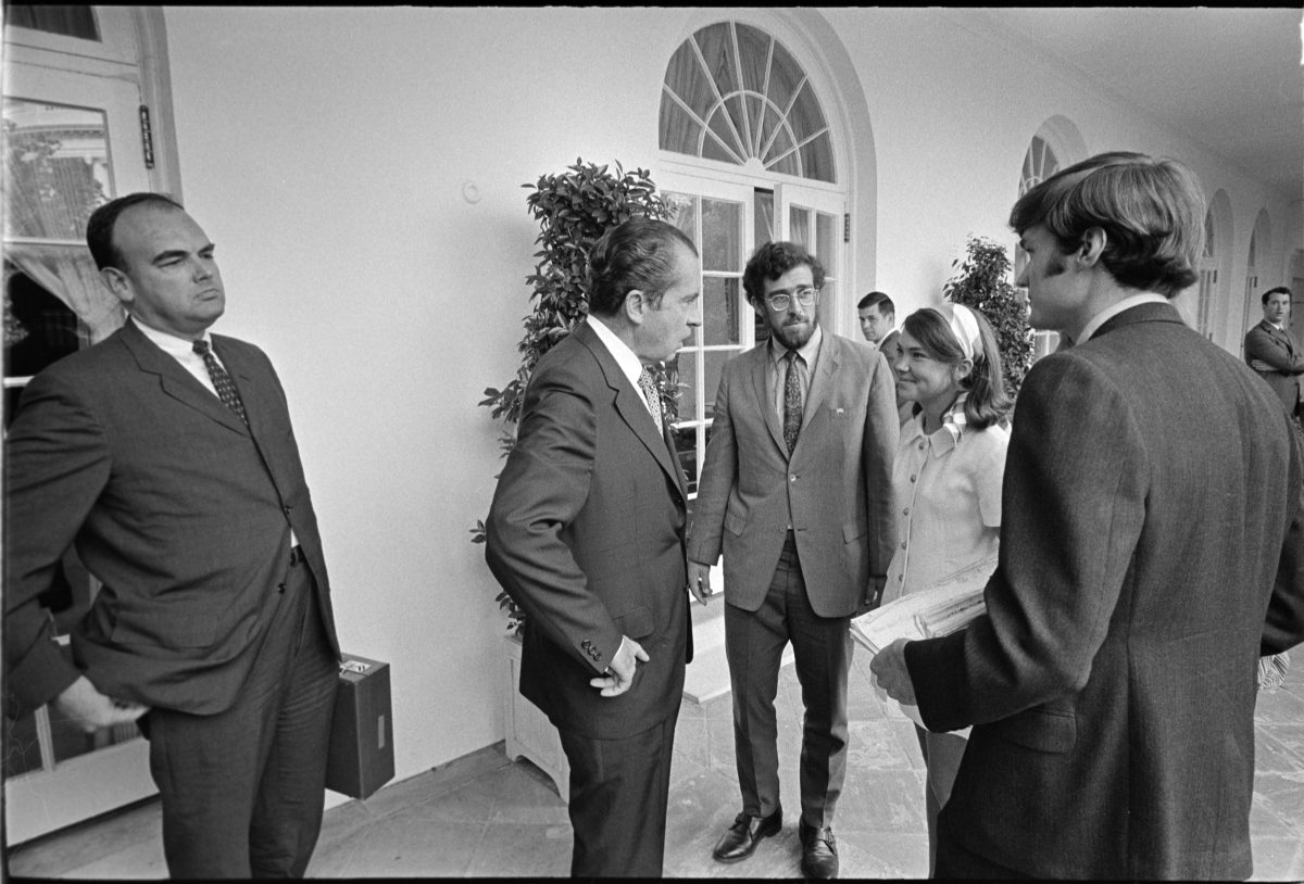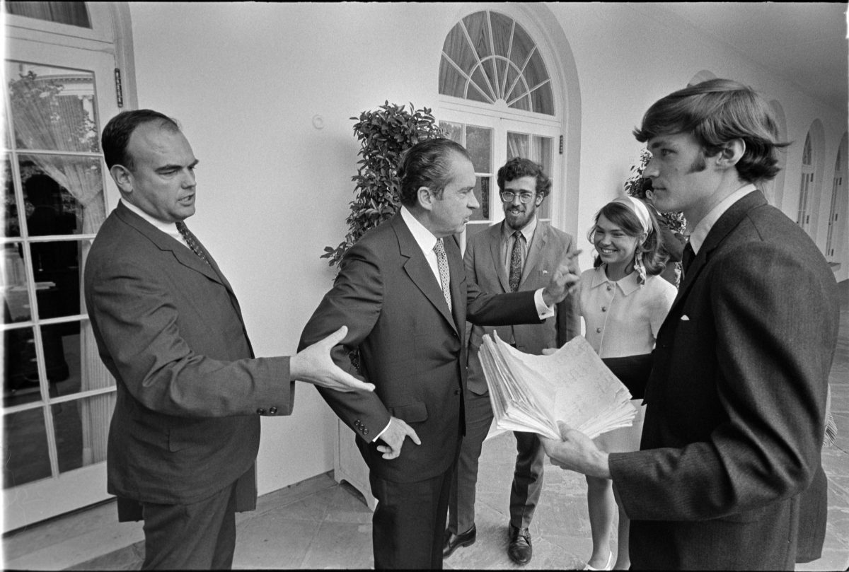 So off we went to the White House and got in, through the good graces of Professor Kermit Hanson (Dean of the School of Economics) whose daughter, Kathy, accompanied us.  He knew John Ehrlichman (left above) who was the Domestic Advisor to Nixon and along with Haldeman, Kissinger, and McNamara were the architects of the Vietnam War–these are the people I needed to chat with.  We first met with Ehrlichman and he spent about 3 hours with us and kept asking to see the petition I held–and I wouldn’t give it to him.  I informed him that it was addressed to the President and we wanted to hand deliver it.  He swung around to his phone and after a few minutes, said to follow him–parking us in the West Wing.  After a few more hours of waiting, we were told we had 15 minutes with the president.  We walked out to the veranda next to the Rose Garden.  There a helicopter was parked and everyone was bustling about.  Ehrlichman told me under no uncertain terms, “Do not hand that petition directly to the President–Ron Ziegler is up-tight!”  (Ron Ziegler was Press Secretary) and gave us the evil eye throughout this meeting.  Of course, I handed it to Nixon and Ehrlichman stepped in and grabbed it–here is that moment.