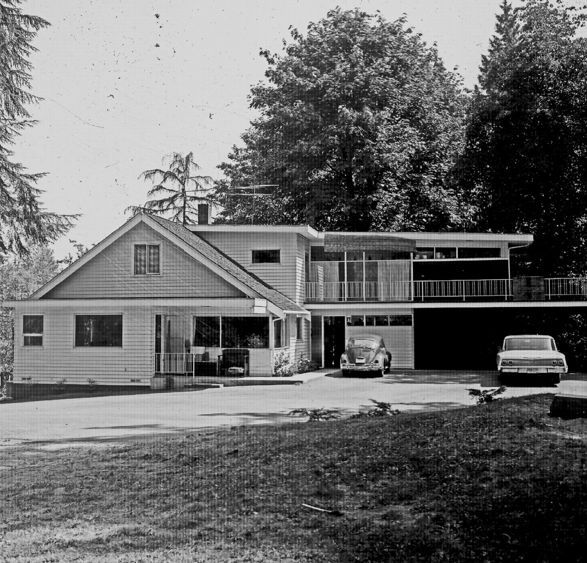 Minor military duties aside, I first moved back home and of course, the neighborhood had changed.  This is the house I grew up in from 1949 to 1963.  It was built in 1936–a cheap farmhouse–uninsulated and with one oil heater.  After the freeways pushed through Juanita (and “eminent domain” half our property), we turned the house around with this ugly remodel.  Jillions of cars roared by–124th was now an onramp to I-405.  With this “progress” came crime and to solve the crime, they put up mercury-vapor street lights.  I tolerated this for six month of this, then moved back to the quiet–downtown Seattle near the UW.   Gotta mention this–My boss at Mayfair one day asked me to drive a gentleman back to his house–that he was too old to walk back uphill the one block–so I obliged: