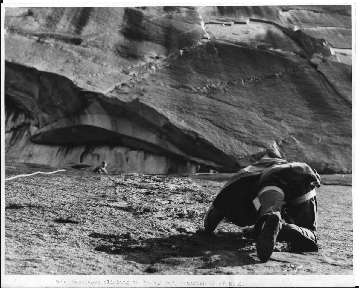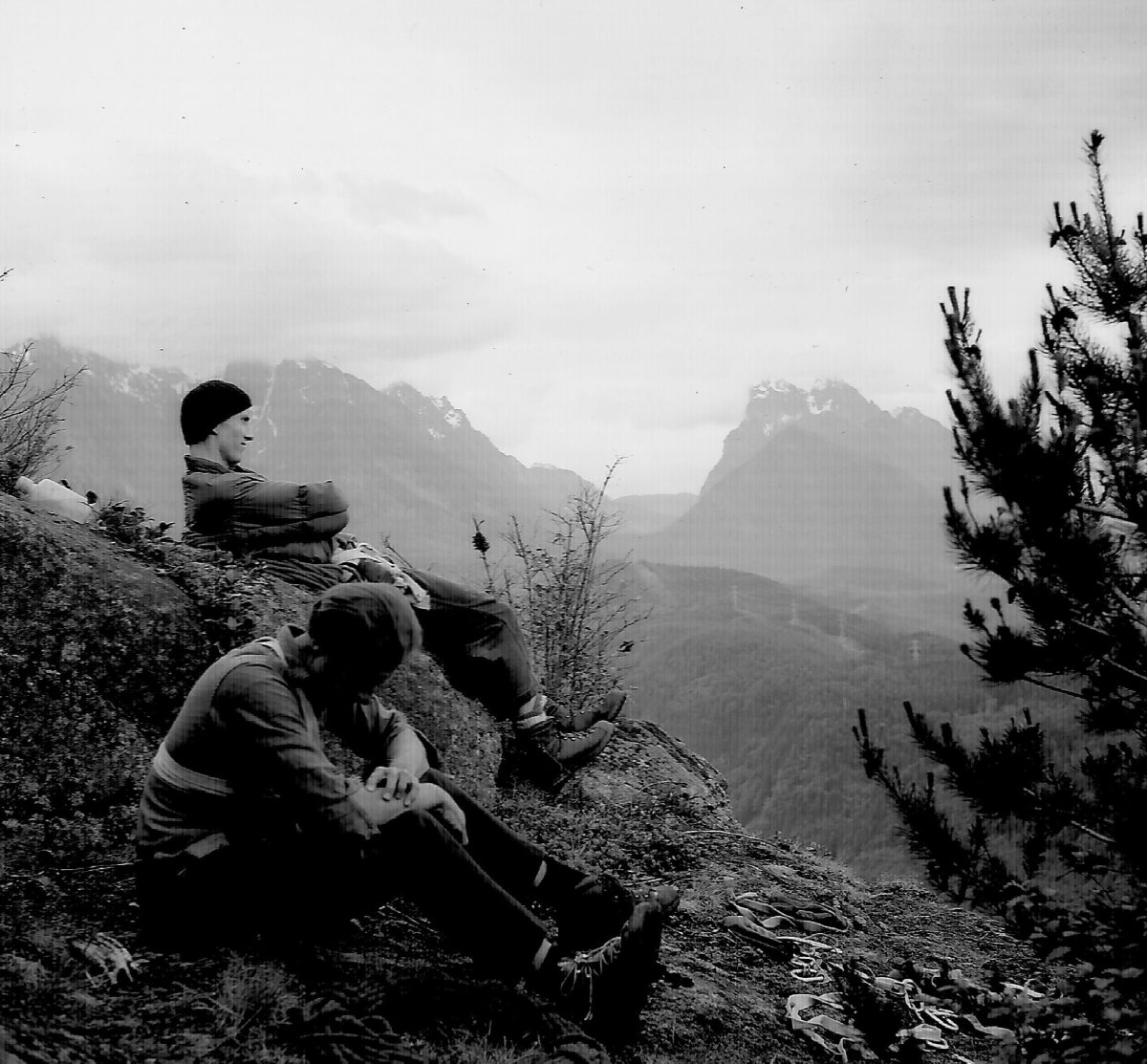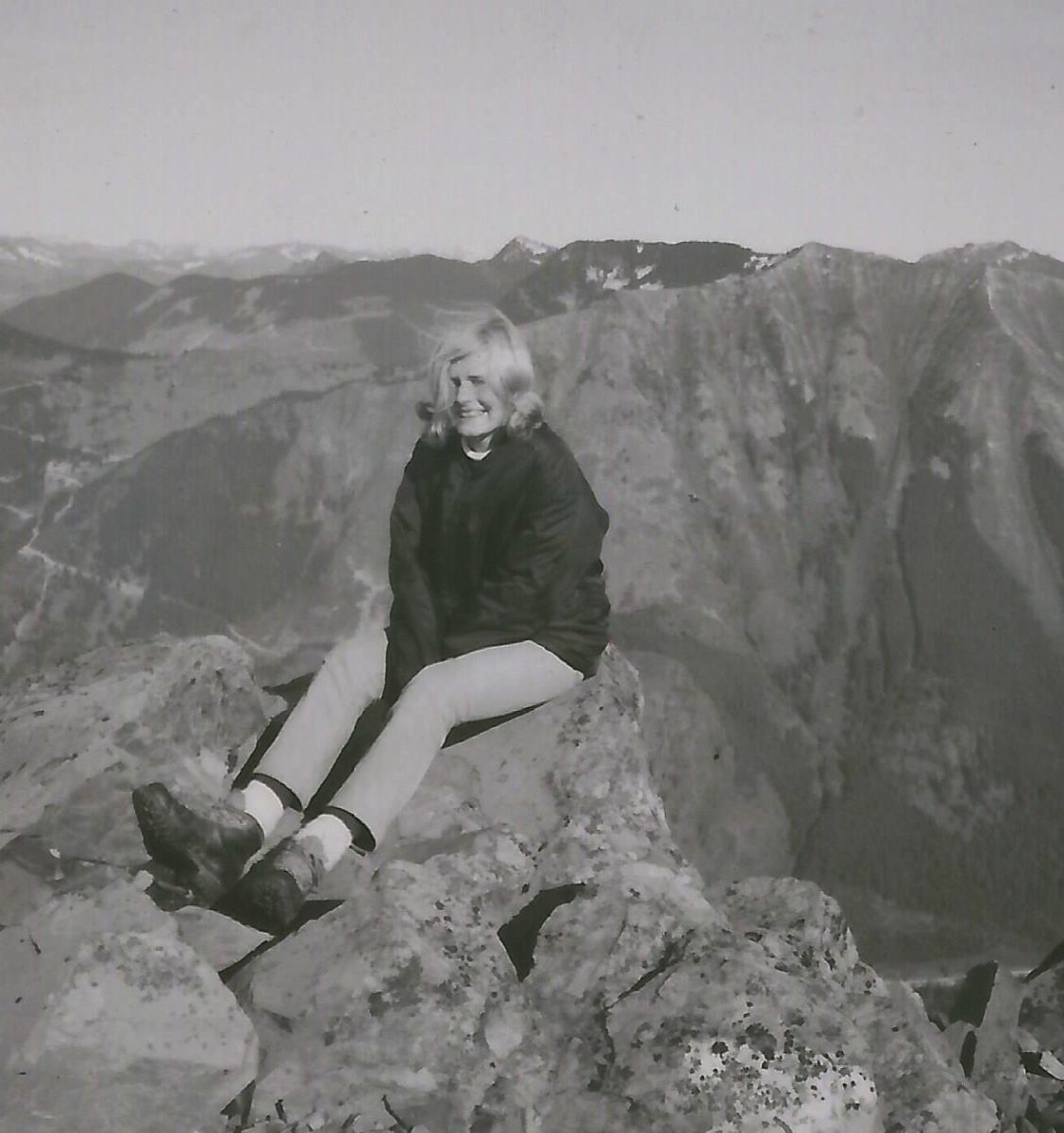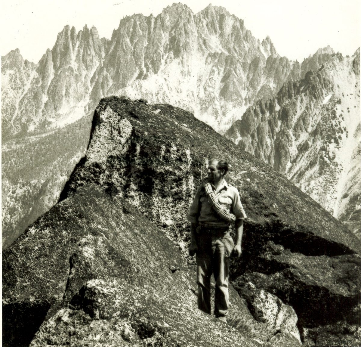 Squamish Chief, British Columbia, climbing the Dike Route.  This was big stuff!  I learned a lot from Fred–we knocked off a fantastic line on the South Early Winter Spire here–perhaps my finest climb.  I was taking intensive Russian then and cut up my book to lighten my load up this face–I studied as I belayed.  Fred thought I was crazy, but then, I knew he was.  The road was being built across the North Cascades and Fred surmised, correctly, that he had better get the jump on these routes before the road was completed.  We had to walk 20 miles up to the base of this massif–Liberty Bell Mountain.  Our routes went up both edges–like bookends.  Here, Fred is on the summit of the South Spire (left)
