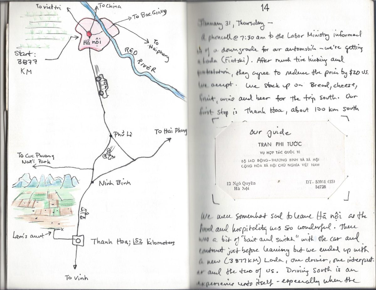 Outfitted in my Viet Cong helmet, Lam (my hotel acquaintance) and I pack in front of the Hoa Binh hotel readying for a trip south.  This was a trip worthy of a separate post–and in fact, I wrote an illustrated diary of this trip at the time–a page of which is here:
