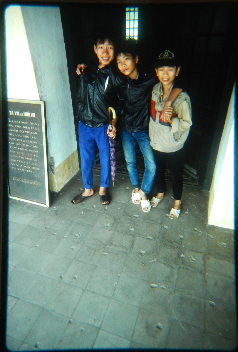 A river crossing.  Lam and I stayed a few days in Hue where most of his family lived.  His relatives took is in and planned a huge feast–it was nearing Tet, their New Years.  Vietnam was at war with China then (they always are at war with China) but they stopped the hostilities and opened the borders up so beer could be transported across for Tet.  We feasted!  And what a family–all the girls gathered around and wanted me to send them perfume and US trinkets when I returned.  Their father, a Tai Chi instructor was a most gracious host–his house was filled with meritorious awards and photos in all sorts of Tai chi poses.  His mother was shot and killed by US Marines during a lock-down just before the American War ended, when she tried to dash between two houses.  What I found among peoples of both the north and south (it is now one repatriated country for those who haven’t followed the politics) there was absolutely no animosity towards Americans–and in other ways they still admire us.  It was a rather humbling experience.  At a Hanoi dinner–with all senior gov’t officials–I asked one official why they didn’t harbor bad feelings towards us.  He replied as rather nonchalant that they simply won the war and we had lost and that was the end to it.  They wanted to look ahead to their future.